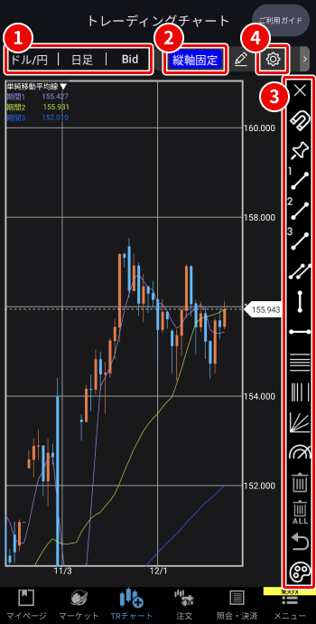 通貨ペア名、足種をタップすると、表示するチャートの通貨ペア、足種を変更できます。