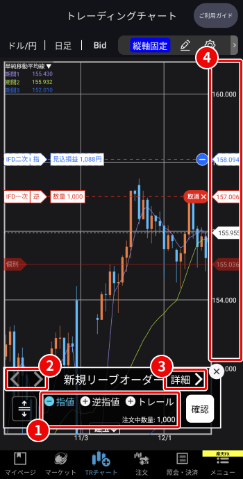 メニューからは、決済注文、訂正、取消、詳細の閲覧、価格軸の自動調整ができます。