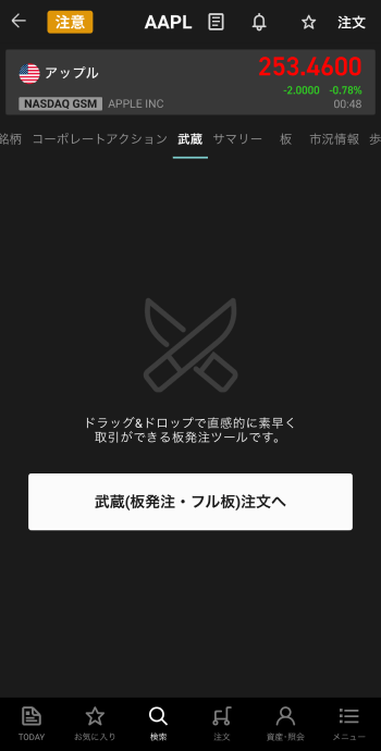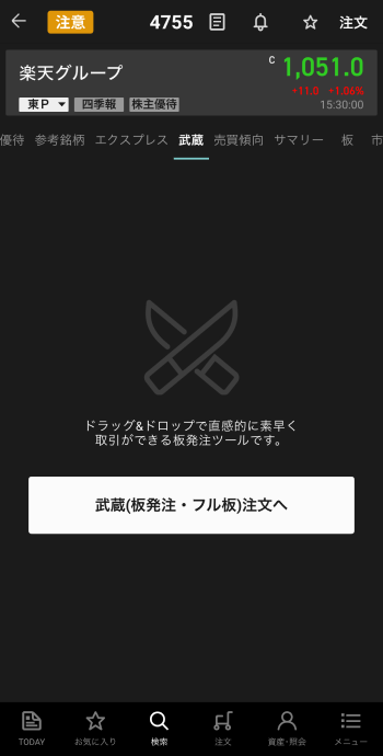 銘柄サマリー⇔板情報⇔市況情報⇔歩み値⇔チャート⇔ニュース⇔四季報⇔ファンダメンタル情報⇔株主優待情報⇔エクスプレス注文⇔武蔵注文⇔売買傾向をスワイプ(タッチしたまま左右にスライド)して切り替えて表示させることができます。